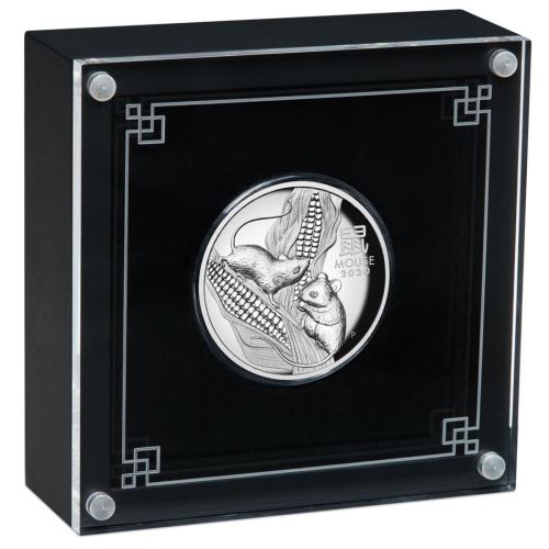 The coin’s reverse design portrays in spectacular detail two mice foraging on husks of corn. Also included in the design is the Chinese character for ‘mouse’, the inscription ‘MOUSE 2020’ and The Perth Mint ‘P’ mintmark.